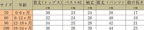 70cm(0-6ヶ月):着丈(トップス)30cm、バスト*2 23cm、袖丈 24cm、着丈(パンツ)38cm、股の長さ 17cm