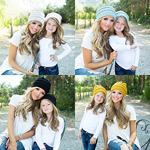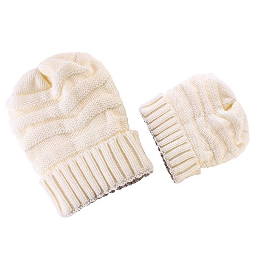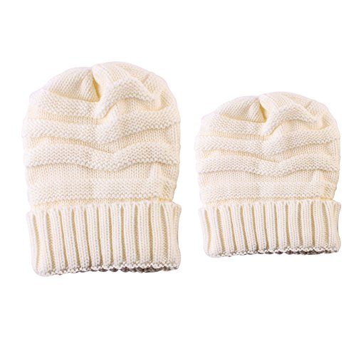 2PCS親子 冬暖かい ニット かぎ針編み ビーニー 帽子 レジャー 伸縮性のある ストライプ スキー帽 (ホワイト)