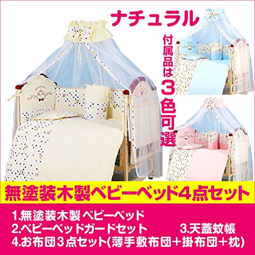 - セット内容:1.無塗装木製ベビーベッド、2.ベビーベッドガードセット、3.天蓋蚊帳、4.お布団3点セット (薄手敷布団+掛け布団+枕)
