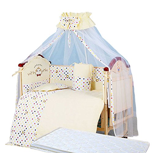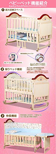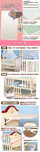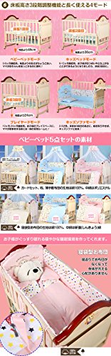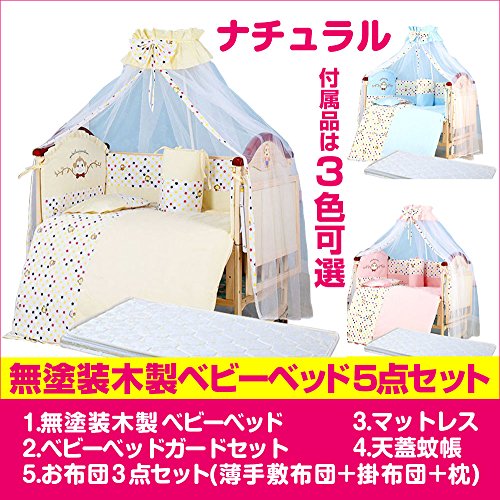 - セット内容:1.無塗装木製ベビーベッド、2.ベビーベッドガードセット、3.マットレス、4.天蓋蚊帳、5.お布団3点セット (薄手敷布団+掛け布団+枕)
