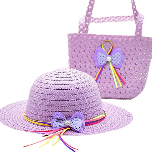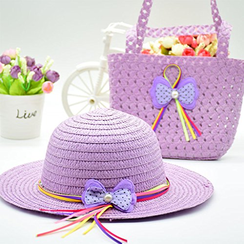 YUEGUANG 子供用麦わら帽子 ハット キャップ UVカットハット 女の子夏日焼け止め帽子 子供ハンドバッグ 可愛い リボン 夏 セット ガールズキャップ ガールズハンドバッグ ビーチ 旅行 外出 記念写真 (パープル)
