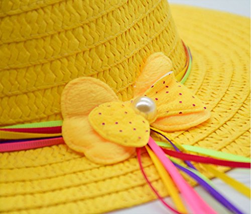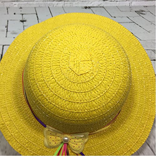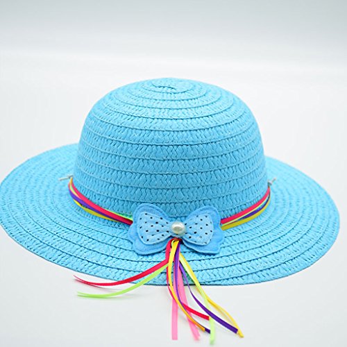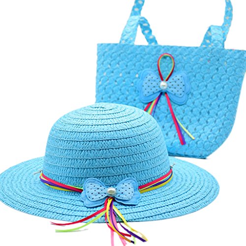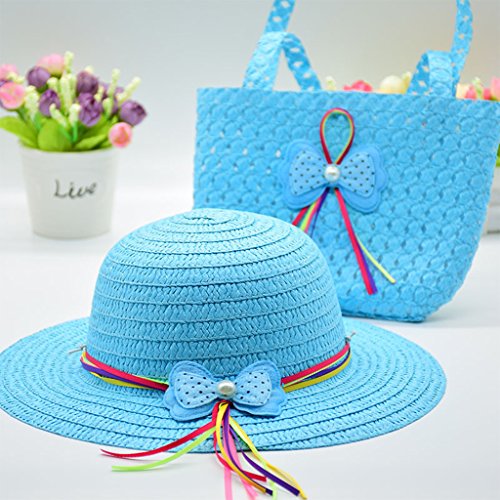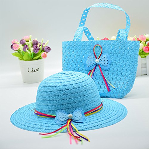 YUEGUANG 子供用麦わら帽子 ハット キャップ UVカットハット 女の子夏日焼け止め帽子 子供ハンドバッグ 可愛い リボン 夏 セット ガールズキャップ ガールズハンドバッグ ビーチ 旅行 外出 記念写真 (ブルー)