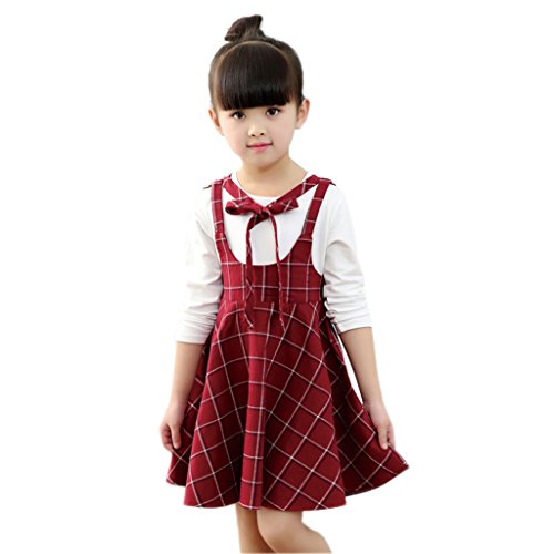 YUEGUANG 子供服 女の子フォーマルドレス チェック柄 韓国風 女の子 ワンピ ドレス ブラックワンピ+Tシャツ 上品 ジュニアドレス ワンピース フォーマルドレス 洋服 長袖 発表会 七五三 入園式 卒園式 冠婚葬祭 結婚式 パーティー 女の子 キッズ ワンピース リボン飾り (140cm, ワインレッド)
