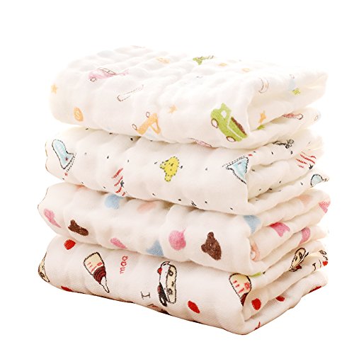 YUUWAベビーハンカチ 速乾吸水 6重ガーゼ 綿100% ループ付き ハンドタオル 可愛いキャラクター 通気 赤ちゃん よだれカバー ループ付き ふわふわ 4枚セット 30×30