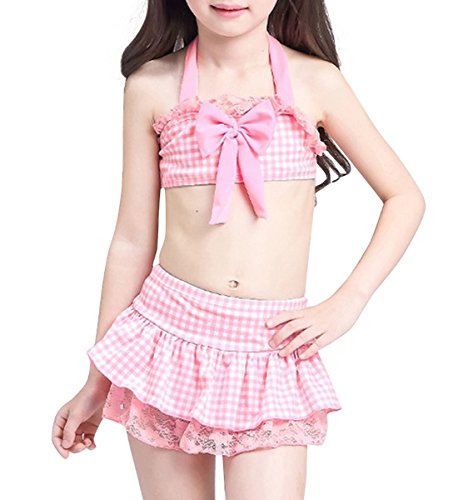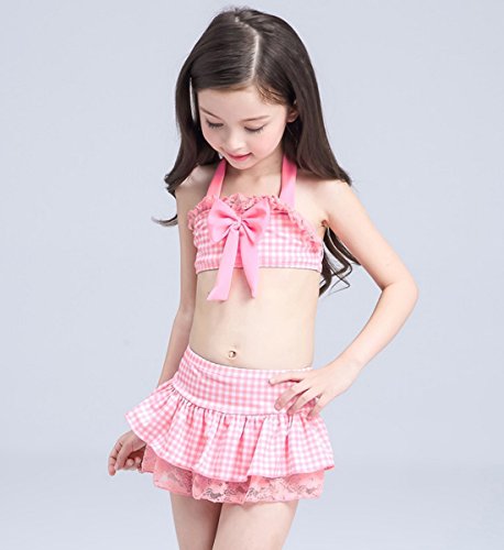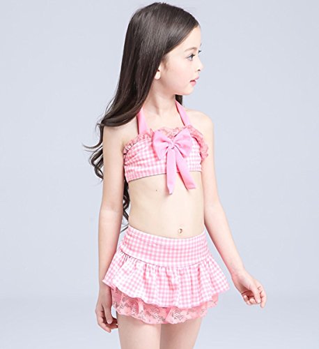 YY-Natuhi 水着 女の子 ビキニ セパレート 上下セット ベビー スイムウェア タンキニ 子供水着 水泳 ワンピース チェック柄 キッズ ガールズ かわいい 女児 リボン フレア スイムウェア (M(身長90~100cm、体重15~20kg), 2ピンク)