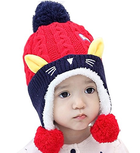 YY-Shop ベビー帽子 ニット帽子 男の子 女の子 新生児 秋冬 ニット キッズ帽子 キャップ かわいい ポンポン付き 子供 裏起毛 防寒 ハット 出産祝い 防風 猫ちゃん(0~2歳) (1レッド)