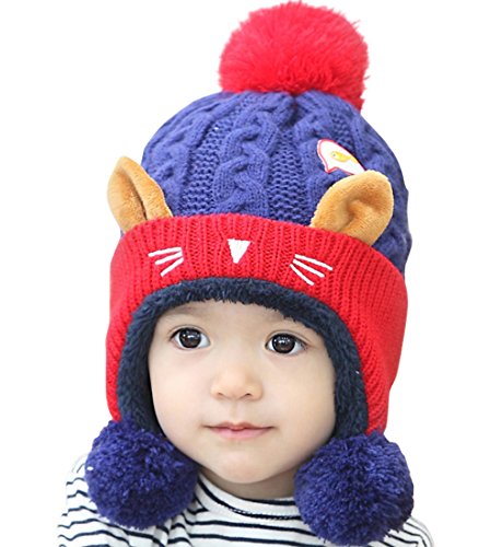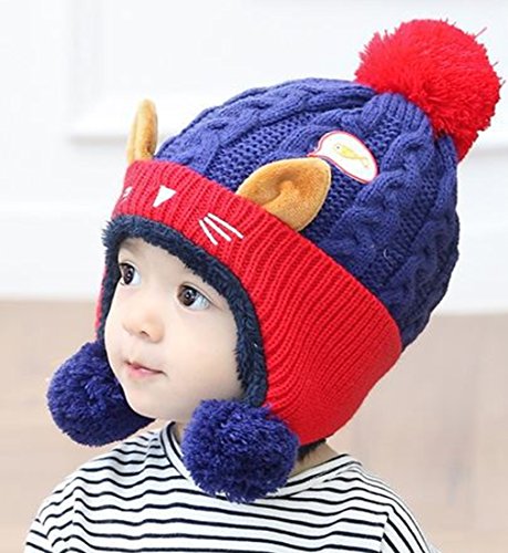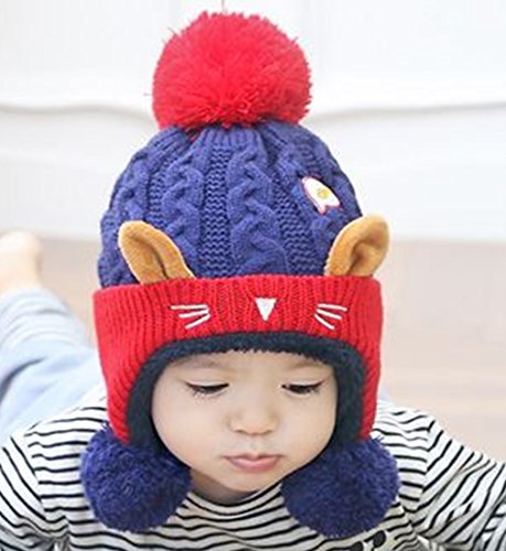 YY-Shop ベビー帽子 ニット帽子 男の子 女の子 新生児 秋冬 ニット キッズ帽子 キャップ かわいい ポンポン付き 子供 裏起毛 防寒 ハット 出産祝い 防風 猫ちゃん(0~2歳) (2ネイビー)