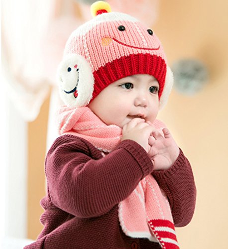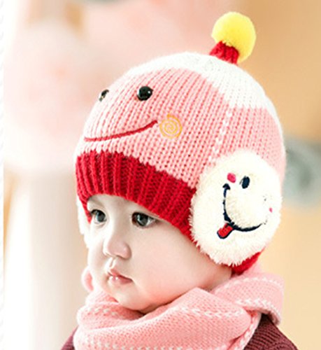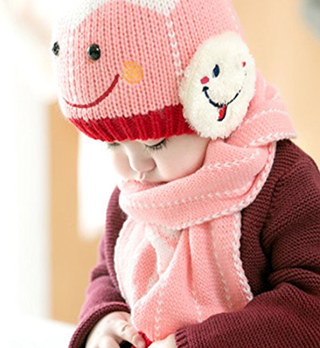 YY-Shop ベビー帽子 マフラー 二点セット 男の子 女の子 新生児 秋冬 ニット キッズ帽子 キャップ かわいい 子ども ニット帽子 防寒 耳まであったか 耳あて 笑顔 防風 (0~2歳) (3ピンク)