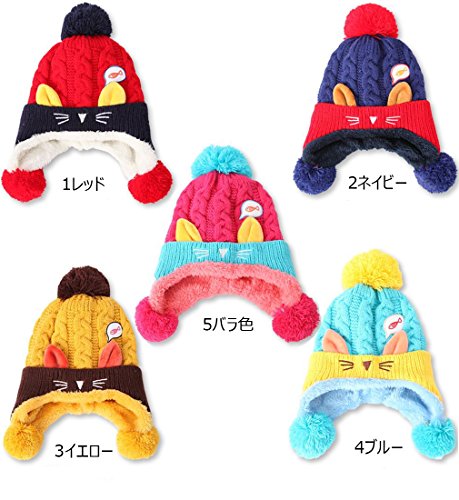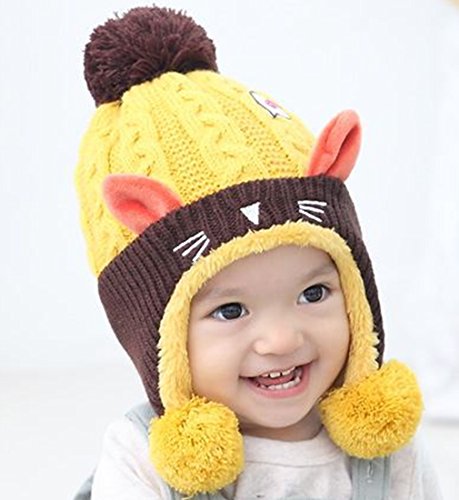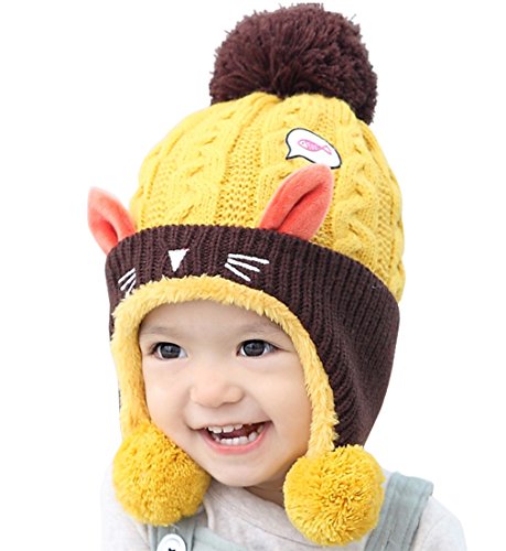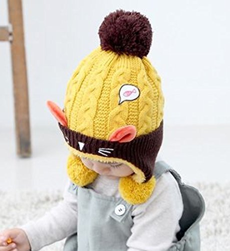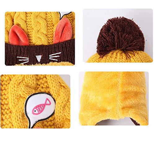 YY-Shop ベビー帽子 ニット帽子 男の子 女の子 新生児 秋冬 ニット キッズ帽子 キャップ かわいい ポンポン付き 子供 裏起毛 防寒 ハット 出産祝い 防風 猫ちゃん(0~2歳) (3イエロー)