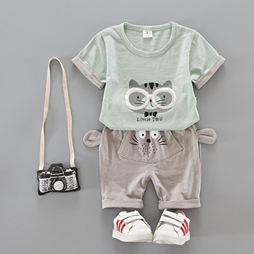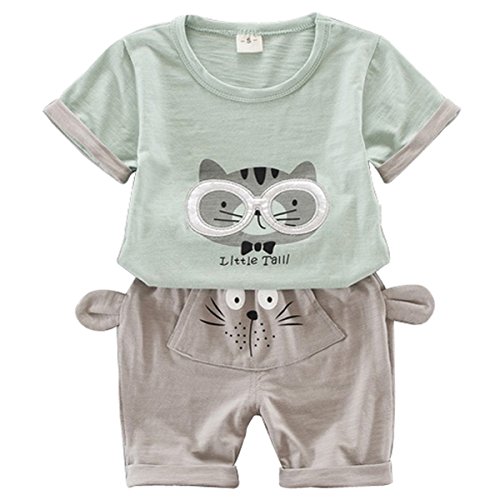 YY-Natuhi ベビー服 子供服 男の子 女の子 上下2点セット 半袖 トップス ズボン トレーナー キッズ服 春夏 幼児 0~3歳 ルームウェア セットアップ ボーイズ かわいい 猫柄 シャツ ショートパンツ (L(身長85~95cm), 3グリーン)