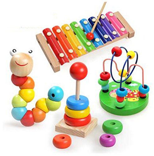 木のおもちゃ 知育玩具セット 4点入り シロホンクマ ビーズコースター 木製タワーがさね キャタピラー 指先トレーニング ミニ カラフル 幼児 子供 積み木 お祝い プレゼント 2−3歳 創造力と想像力を育てる 幼児教育