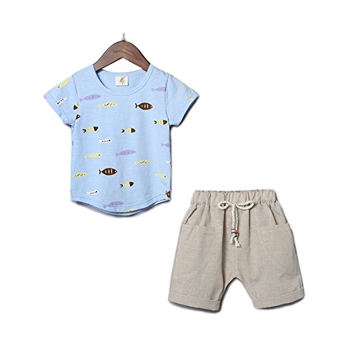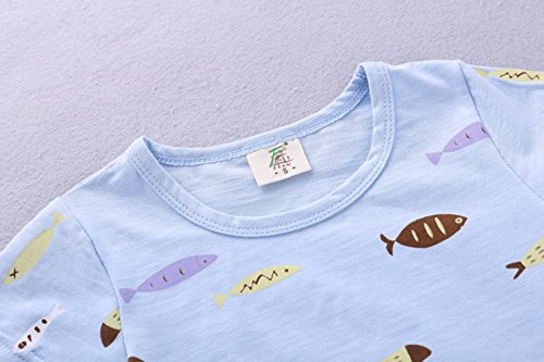 YiYa 子供服 ベービー服 セットアップ 男の子 男児 赤ちゃん べビー セット服 セットアップ 2サイズ選べる ブルー/ホワイト 小魚半袖Tシャツ+パンツ 誕生日 子供の日 遊園地に 上下 2点セット 夏 1-3歳 80-110cm 子供 薄いセクション 綿 上着&ズボン キッズ 幼児 (90cm, ブルー)