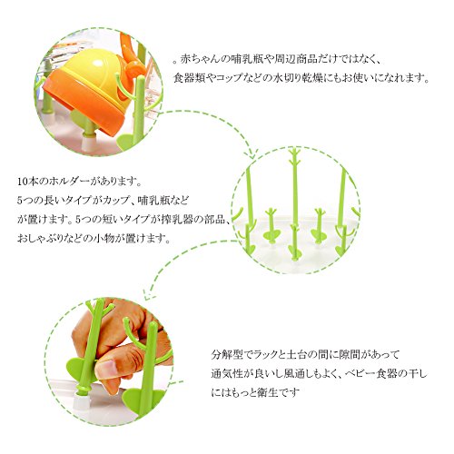 - 本体の底部分は水切りトレイ、長短くねくねバーは、色々な形のほ乳びん、乳首や小物を乾燥できる、取り外せるので、お出かけの時も携帯するのに便利です。