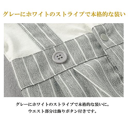 - グレーにホワイトのストライプで本格的な装いに、ウエスト部分は飾りボタン付きです,縫い付けのバッククロスベルトです、着脱の際も簡単ながらお洒落さも兼ね備えています
