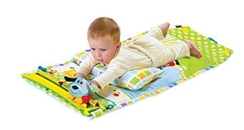 Portable tummy time development mat;battery operated, motion track buggy - Easy attach track affixes to straps on mat;Includes two buggy attachable, multitextured Farm Figures - Cow and Dog;Hidden Pocket for additional accessories;Folds conveniently into a self contained Roll n Go carrying case for easy transport