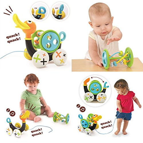 ①しっぽを回してひもを引っ張るとアヒルが歩きながら、楽しいミュージックに合わせて歌をうたいます。②ひもをひっぱってアヒルを操るので、お子様の歩こうとする意欲を促します。③お子様が歩くのをやめると、アヒルも一緒にストップ。スイッチオンのまま放っておくと遊んで欲しそうにたまに鳴いたり、くちぶえを吹いたり④背中に乗せている宝物のビーズはラトルとしても遊べます。⑤しっぽを回すだけの簡単操作でスイッチON/OFFの切替が出来ます。消音モードでも遊べます。