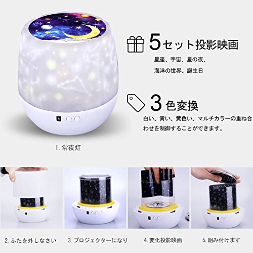 - 【多い場所に適用】①ナイトライトとして、客室やベッドルームなどの室内で星空を楽しみながらリラックスし寝ます。目に優しいライトなので、枕元灯や授乳やおむつ替え時の照明灯として使用できます。②デコレーションとして、パーテイー、祭りにも最適。子供、彼女、家族、友達には最も適当なプレゼントです。
