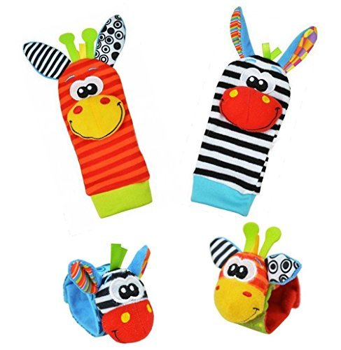Baby Learning Fun - Animal Wrist and Sock Rattle Soft Developmental Toy Gift Set 4 Pcs - Zebra & Giraffe [並行輸入品]