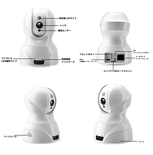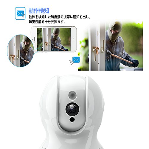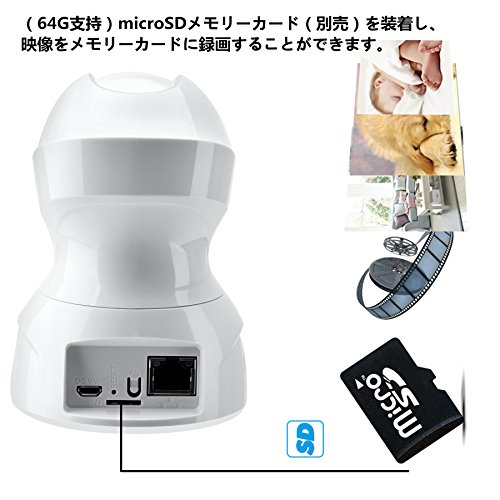 - 音声双方向機能を付きます。カメラー本体にマイクを内蔵しているし、映像と共に音声も聞くことができます。動体検知機能もありますので、動体を検知するとスマホのアプリにメールを自動送信します。 4.録画機能搭載を付きますし、カメラにmicroSDメモリーカード(別売)を装着すると、映像をメモリーカード