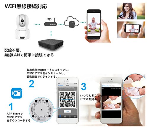 - ネットワーク設定も簡単:カメラが自身でLANケーブルとWiFiアンテナを持っていて、無料のAndroid/iPhone用のアプリ『MIPC』をダウンロードして、WiFiとつなげば見られます。