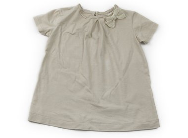 後に一つボタンのあるカットソー、ラメ糸の入ったリボンが可愛いです。シミ汚れがなくまだまだお使いいただけます。品質表示素材タグが切られています。実際のサイズ表記は98cmです。