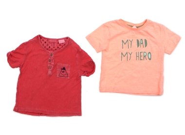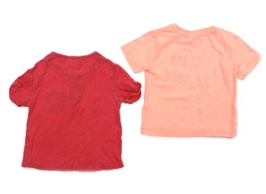 実際のサイズ表記は74cmです。薄蛍光オレンジ色のTシャツは毛羽立ちや小さな毛玉がありますが、まだまだ普段着として活躍してくれそうです。赤系のTシャツは全体的に色褪せ感があり、ブランドタグに色移りがあります。お得なセット価格です。品質タグはありません。