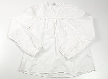 実際の表示サイズは7~8years,128cmとあります。前と左腕後ろ部分に小さなシミがありますが小さく、薄いため目立ちません。フリルがついておりとてもお洒落な商品です。