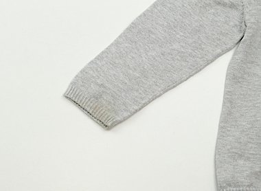 実際のサイズ表記は86cmです。品質タグが切ってありますが、コットンふうのハイゲージニット。衿ぐり、袖口、前身頃に広範囲でシミがあります。普段着としていかがでしょうか。おまけでMUJIのボーダーカットソー(90cmサイズ。若干毛羽立ちがありますが目立った汚れはありません)つきです。