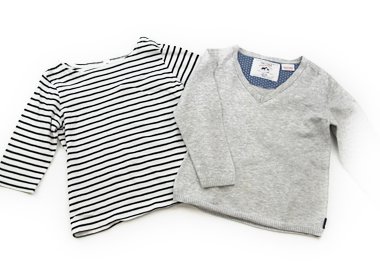 - 実際のサイズ表記は86cmです。品質タグが切ってありますが、コットンふうのハイゲージニット。衿ぐり、袖口、前身頃に広範囲でシミがあります。普段着としていかがでしょうか。おまけでMUJIのボーダーカットソー(90cmサイズ。若干毛羽立ちがありますが目立った汚れはありません)つきです。