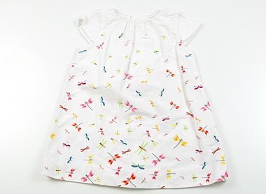 しっかりしたコットンのワンピース。全体的に毛羽立ちがあり、前・後裾付近に複数薄いシミがあります。実際のサイズ表記は86cmです。普段着としていかがでしょうか。