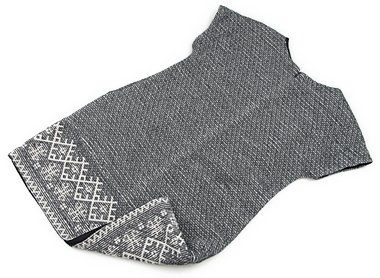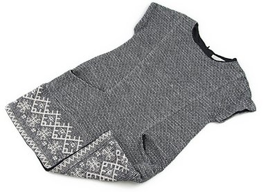 実際のサイズ表記は9/10 140cmです。しっかりした厚手の生地。ひっかけによる糸の飛び出しが多数ありますが、お手持ちのカギ針などで裏から引き出していただくと補修ができそうです。丈が短めですのでチュニック風にも。