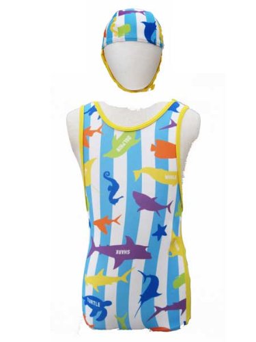 ベビースイミング スイムキャップセット(海の仲間柄)子供用 水着 ザジーザップス Zazzy Zapsの説明 スイムキャップ付きレスリングタイプの水着です。 水泳教室や小学校 幼稚園 保育園等のプールに 海や川遊び夏場は、大活躍です。 お子様を強い日差し、紫外線対策に最適。 生地にUVブロックUPF50を使用 何も付けていない場合に比べて赤く炎症を起こす までの時間が50倍になるという目安です。 (生地が伸びている場合や濡れている場合は評価が 低下する場合があります。) 御使用の際必ず水着の取り扱い注意をよく読んでから ご使用ください。