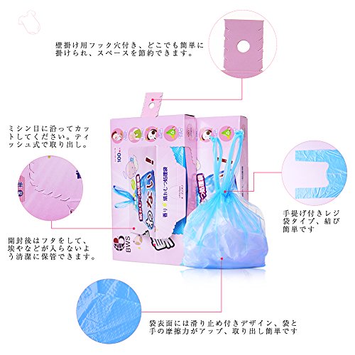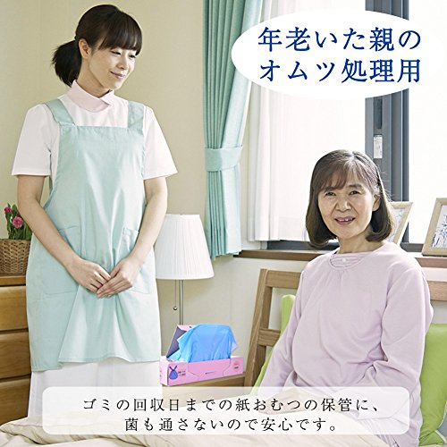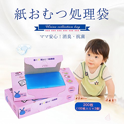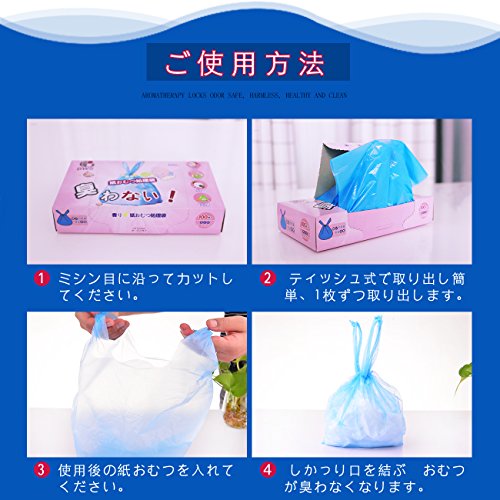 ママ安心!子供のおむつ処理袋として、口をしっかり縛ってしまえば全く匂いません。ミシン目を開けると1枚ずつきれいに取り出せます。使用後は閉めに収納できます。結びやすさにこだわった手提げ付きレジ袋タイプです。 袋には1枚で紙おむつ2-3枚入り、かわいいブール色付き、香り付きで中身も見えず、嫌な臭いをしっかり閉じ込めるため、おむつだけではなく、使用済み生理用品、出先での汚れ物を入れたり、なにかと便利にご使用いただけます。 女性に優しい商品です。妊娠中の友達におすすめてください!知り合いに子供産まれたら贈れる出産祝いギフトです。 この袋があると、おむつ用のゴミ箱が必要ないです。口をしばって燃えるゴミに捨てられます。ゴミの日まで3日間いやな臭いの発生を防ぎ。脱臭効果を持続させます!