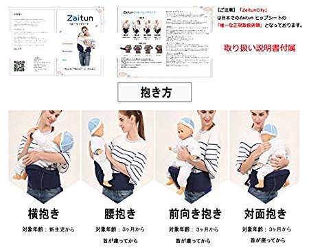 - 【ご注意】「ZaitunCity」は日本でのZaitun ヒップシートの「唯一な正規取扱店舗」となり。是非、ご購入の際は、販売店舗名の確認を宜しく。正規品は取り扱い説明書付属、また正面には中国語のラベルが付いておりません。商品到着後、右側の梱包写真を参照し、正規品のご確認をよろしく。