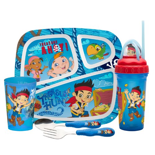 Five-piece set includes 3-section tray, stainless steel flatware, Buddy Sip straw cup and 14.5oz tumbler;Set features licensed Jake and the Neverland Pirates graphics to make mealtime fun;Durable, BPA-free construction of melamine, plastic and stainless steel;Dishwasher safe and easy to care for;Recommended for children ages 3+