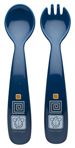Spoon and fork are built to promote independent eating for toddlers and simplify mealtime for parents with innovative design details and materials, Curved shape, work perfectly with Toddlerific bowl and 3-section plate, easy for toddlers to scoop up food with success, Comfort grip handle easy for little hands to hold, fork tines are rounded for safety, Geometric monkey art decal never comes into contact with food, making it truly microwave safe, Made of durable, break-resistant BPA-free plastic, dishwasher and microwave safe