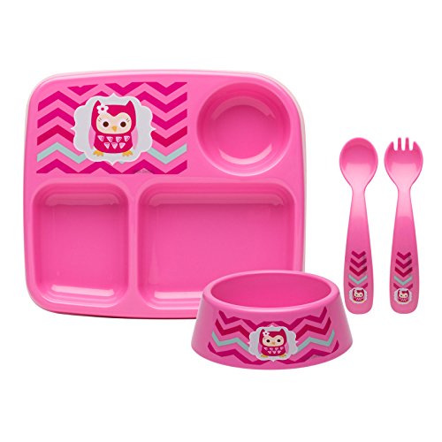 Set includes no-tip 3-section plate, no-tip bowl, fork and spoon; built to promote independent eating for toddlers and simplify mealtime for parents;No-tip design has a wide, stable base, reducing accidental spills; flatware scoops food easily and has rounded tips for safety;Plates and bowls stack for easy, compact storage; Flatware edges are rounded for safety;Geometric owl art decal never comes into contact with food, making it truly microwave safe;Made of durable, break-resistant BPA-free plastic; dishwasher and microwave safe