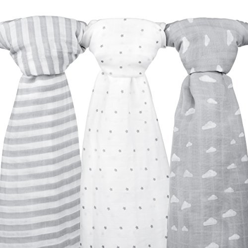 Muslin Baby Swaddle Blankets 47x47 (3 Pack) Grey Cloud Stripe & Stars [並行輸入品]