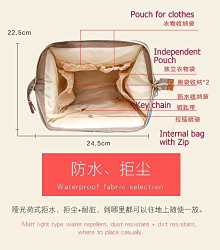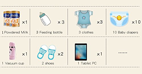 Material: Super-waterproof Polyester Water resistant, excellent quality. Top zipper closure. Size: L, 27cm * 20cm * 40cm Snap closure on handles. Front zippered pocket (with 3 insulated bottle pockets and a mesh pocket inside). Main compartment: 4 open pockets, a zippered wall pocket, a water resistant zippered pocket and a key clip.
