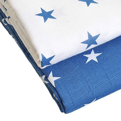 Crisp, eye-catching star pattern in stylish navy blue and white. Looks great worn as a breastfeeding scarf.;Bamboo muslin cotton is extremely soft and silky on baby's skin. Gets softer with every wash.;Light, open weave makes them breathable, perfect to prevent overheating when swaddling babies.;Large rectangular size is ideal when out and about as a travel mat, changing mat, pram shade, car seat liner.....the list of uses is endless!;Colour fast, machine washable and suitable for tumble drying