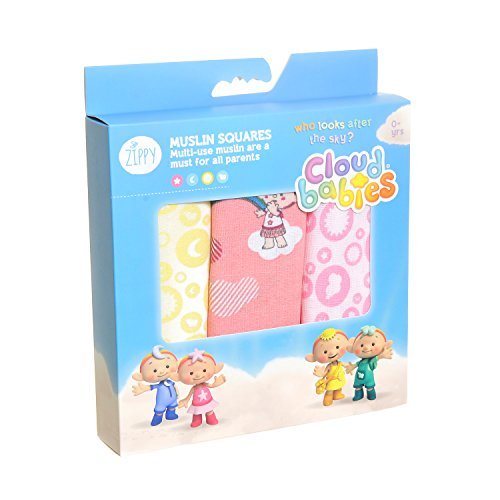 Cloud Babies Muslin Squares by Zippy! The characters we know and love are on these colourful fun muslin squares which your little one will love!;Light, open weave makes them breathable, perfect to prevent overheating;Sized to easily add to a change bag, Zippy muslins are stylish essentials when out and about;Colour fast, machine washable and suitable for tumble drying;Soft on baby's skin, they are great as a comfort blanket, bib or burp cloth. Get softer with every wash.