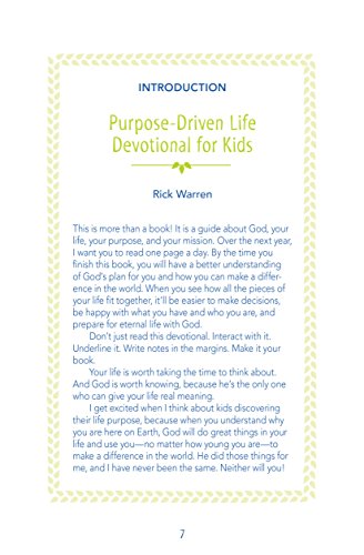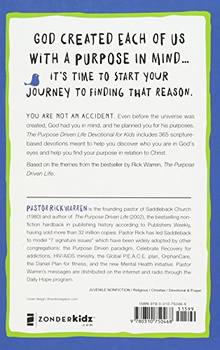 Based on the New York Times bestselling book The Purpose Driven Life, this 365-day devotional The Purpose Driven Life Devotional for Kids, offers inspiration for children 9-12. Most children at this age form their foundational thoughts about God and their place in the world. This devotional, from Rick Warren, will guide readers to a deeper understanding of their purpose.