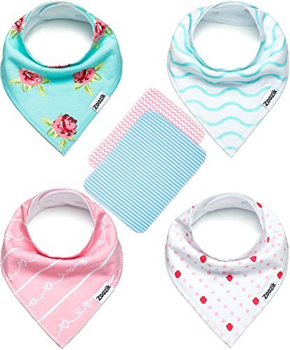 ABSORBENT COTTON DROOL BIBS - These stylish drool bibs are made from 100% absorbent cotton on the front and 100% super soft polyester fleece on the back. They will keep your little one completely dry while maintaining comfort. Perfect for teething babies!;ADJUSTABLE NICKEL-FREE SNAPS - Each bandana bib has 2 convenient, nickel-free snaps that allow each bib to be adjusted to comfortably fit newborns to toddlers, while also keeping your baby secure - babies won't be able to pull them off, but it's easy for parents to snap on and off.;UNIQUE BABY GIFT SET - Do you need a gift for a new mom or dad, new grandparents, holidays or a Christmas present? Our 4-pack of baby bibs make a great gift that every mom will ADORE for her little one!;STYLISH & HIGH QUALITY- Our bandana bibs are reliable and safe, made from the highest quality fabric on the market, while also maintaining style - this girls set enhances the look of any outfit, so little girls always look their best! This is the ultimate pack that will keep your baby fashionable, safe, and dry.;100% SATISFACTION OR YOUR MONEY BACK - We understand first-hand how difficult shopping for baby products that actually work can be. That's why we only ever produce quality and stylish products that we can confidently recommend to our family and friends. That's why our product is backed with a 100% Money Back Guarantee. If for whatever reason you're not 100% satisfied, we'll refund your money! You have literally nothing to lose!