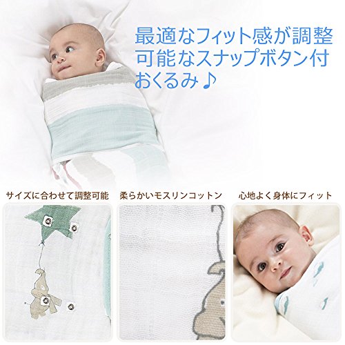 - 柔らかな触り心地、伸縮性、通気性、耐久性に優れた高品質なモスリンコットン100%のスナップボタン付きおくるみ(swaddle)です。