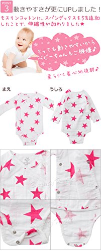 長袖タイプのベビーロンパース。通気性抜群のモスリンコットンを使用しているから汗をかきやすい赤ちゃんも快適に過ごす事ができます。