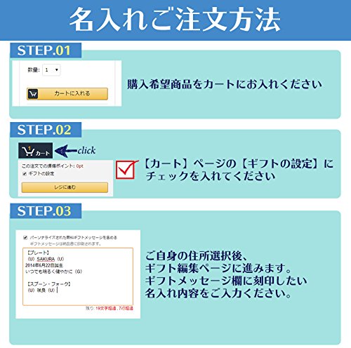 - 「ギフトの設定」にチェックを入れ、ギフトメッセージ欄にてご希望の刻印内容をご連絡下さい。