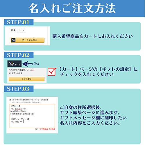 - 「ギフトの設定」にチェックを入れ、ギフトメッセージ欄にてご希望の刻印内容をご連絡下さい。