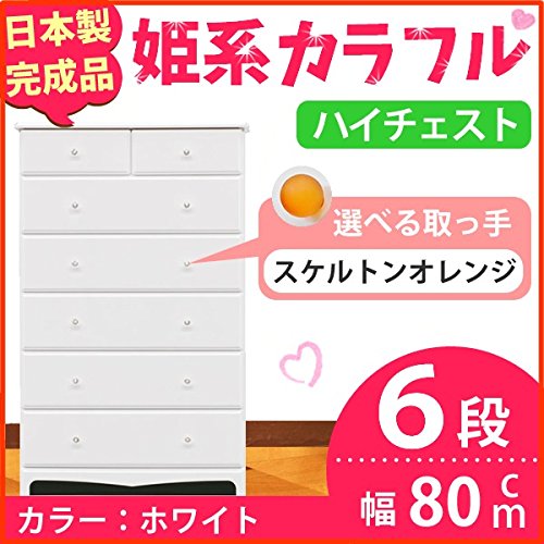 姫系カラフルハイチェスト/収納タンス 【6段 ホワイト×取っ手:スケルトンオレンジ×全12個】 幅80cm 日本製 【完成品】 生活用品 インテリア 雑貨 インテリア 家具 収納家具 子供用家具 ベビー、キッズチェスト