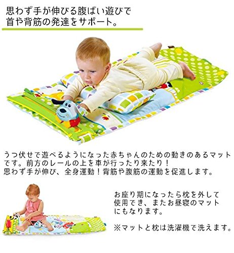 - うつ伏せで遊べるようになった赤ちゃんのための動きのあるマットです。車が目の前を行ったり来たり、とっても興味があるから背筋を使ってより近くに、手を伸ばして全身運動!!丸めるとバッグのようになって、お出かけにも便利です。 製造国:中国 素材・材質:マット・枕:ポリエステルマスコット:ポリエステル、コポリエステル車:ABS樹脂、熱可塑性エラストマーレール・C環:ABS樹脂 商品サイズ:広げた時:縦101×横44×厚さ13cm、バッグ型:縦21×横45×厚さ16cm 重量:830g 仕様:対象年齢:0ヶ月~電源:単4電池3本使用(別売)洗濯機使用可(マット・枕) セット内容:マット、枕、C環付きマスコット×2、レール、車、取扱説明書 さらに詳細はページ下部をご確認ください。