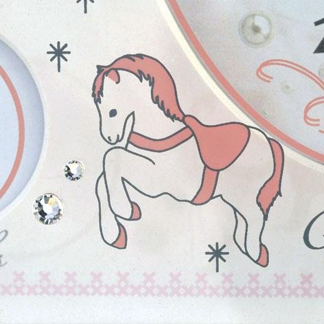 優しいトーンの台紙と、キラキラ光るラインストーンとパステルカラーのキュートなイラストがついたガラスが2層に重なる、12ヶ月フォトフレーム。